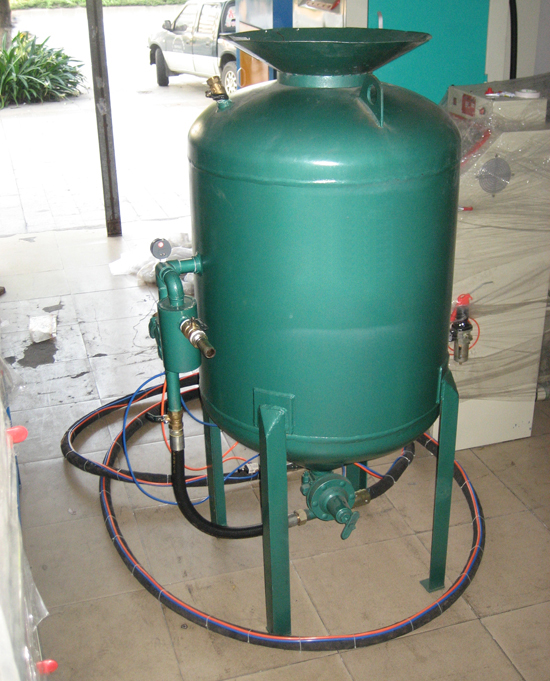 砂阀是喷砂机的重要配件,它的主要作用是控制砂料的开启及关闭、无级调整喷砂时砂流量的大小。砂阀质量的好坏直接影响到喷砂机是否能正常工作,该型喷砂机采用我公司生产的大砂阀,该阀采用美国SCHMIDT公司技术,具有质量可靠、调整方便、维护简单等特点,是世界各国广泛采用的一种结构;该砂阀的开启由气压控制,其动作过程是,当控制口有气压信号时,砂阀的活塞带动阀杆顶起,砂阀开启,通过调整调节帽的位置,就可调节砂阀的开启量,从而控制砂料流量,砂阀的开启量可无级调节,在砂阀中与砂料接触的阀杆和阀套由硬制金碳化钨制作,提高了砂阀的使用寿命。